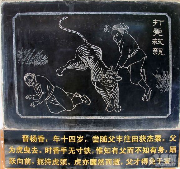 十九、《扼虎救父》晋杨香,年十四岁,尝随父丰往田获杰粟,父为虎拽去。时香手无寸铁,惟知有父而不知有身,踊跃向前,扼持虎颈,虎亦靡然而逝,父子得免于害。杨香,晋朝人。十四岁时随父亲到田间割稻,忽然跑来一只猛虎,把父亲扑倒叼走,杨香手无寸铁,为救父亲,全然不顾自己的安危,急忙跳上前,用尽全身气力扼住猛虎的咽喉。猛虎终于放下父亲跑掉了。深山逢白虎,努力搏腥风。父子俱无恙,脱离馋口中。